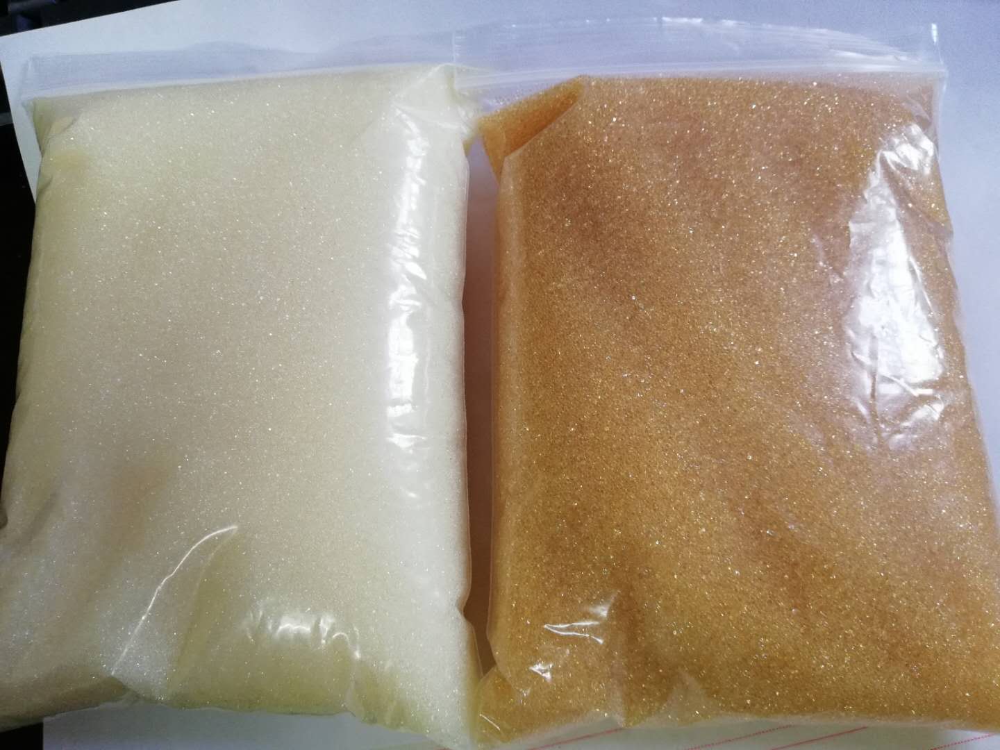 發(fā)生鐵"中毒"的樹脂,從外觀上看,顏色由透明的黃色(陽(yáng)樹脂)或乳白色(陰樹脂)明顯變深,嚴(yán)重者甚至呈黑色。